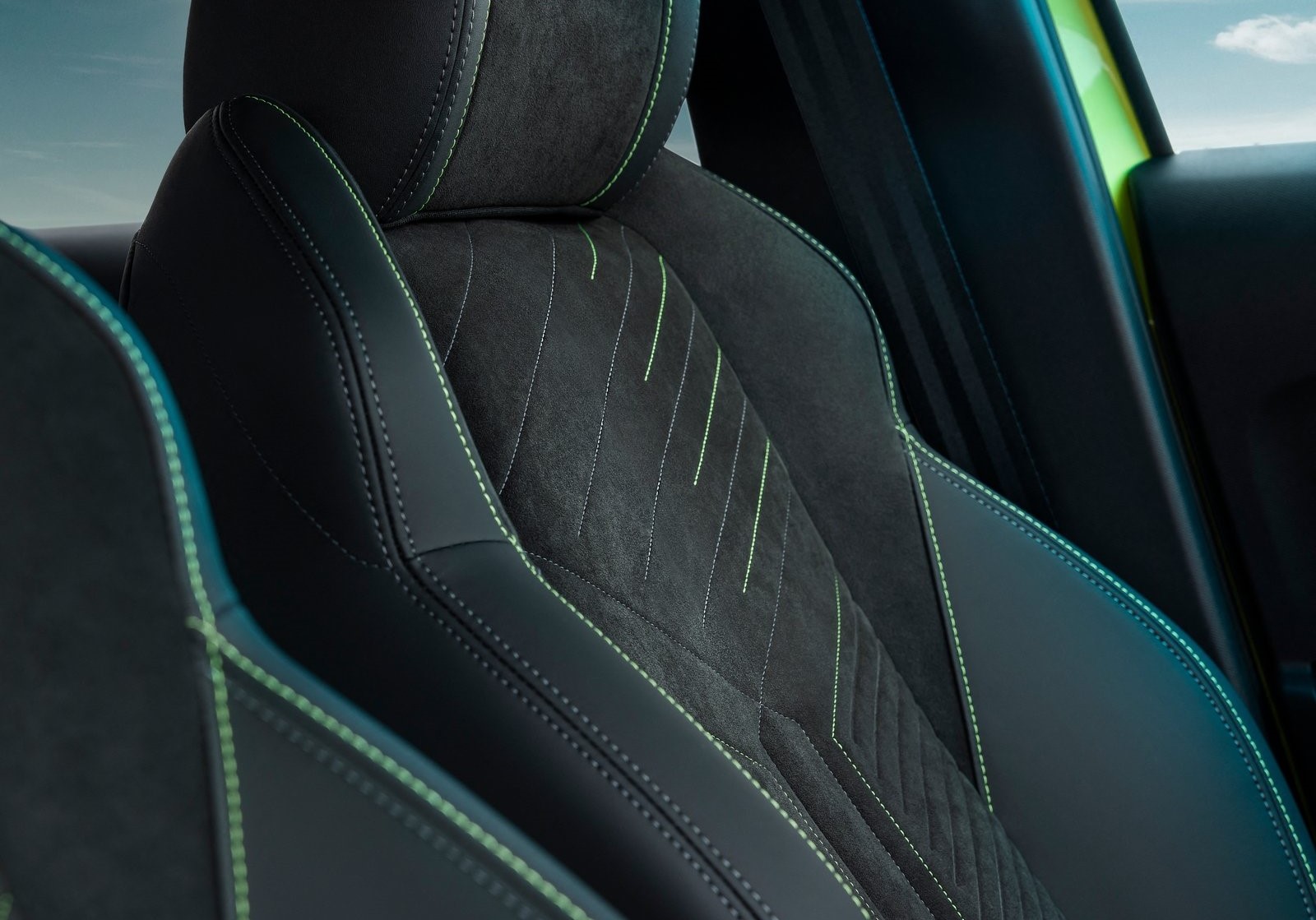 The interior appeal of the New 208 is enhanced by the new seat fabrics , illustrated by the new black Alcantara upholstery with Adamite Green stitching (available as an option on the GT version).
