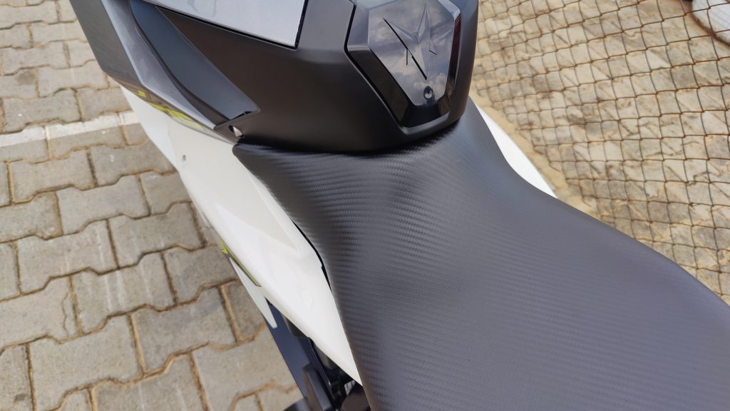The Mantis offers a fairly comfortable riding position, and the riderโs seat feels pretty supportive. The handlebar controls are also set right and are easy to access even while riding. While sitting on the bike though, with my legs down, I realised the top edge of the side panels poking into my inner thighs, which felt quite annoying and inconvenient. The side panels are shaped oddly due to which they stick out. Unfortunately, itโs not something that can be rectified on customer bikes as it requires an entire redesign of the side panels. So, bulkier riders like me will perhaps have to make their peace with it.