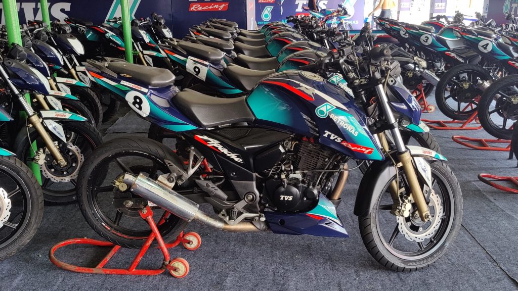Nothing too dramatic: the ‘race-spec’ TVS Apache RTR 200, is fundamentally the same as the road-legal variant that can be bought on the street. The performance mods are limited to a free-flow exhaust, a modified camshaft, and race-spec TVS Remora tyres. Grab rails and other dispensable accessories are removed to shed weight. At this point, with both men and machines primed to hit the track, it’s time to race.