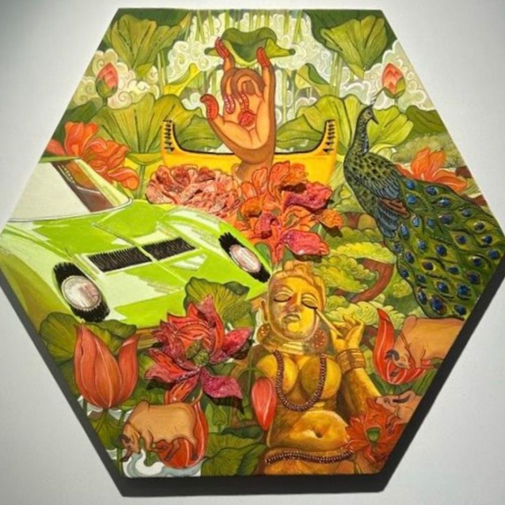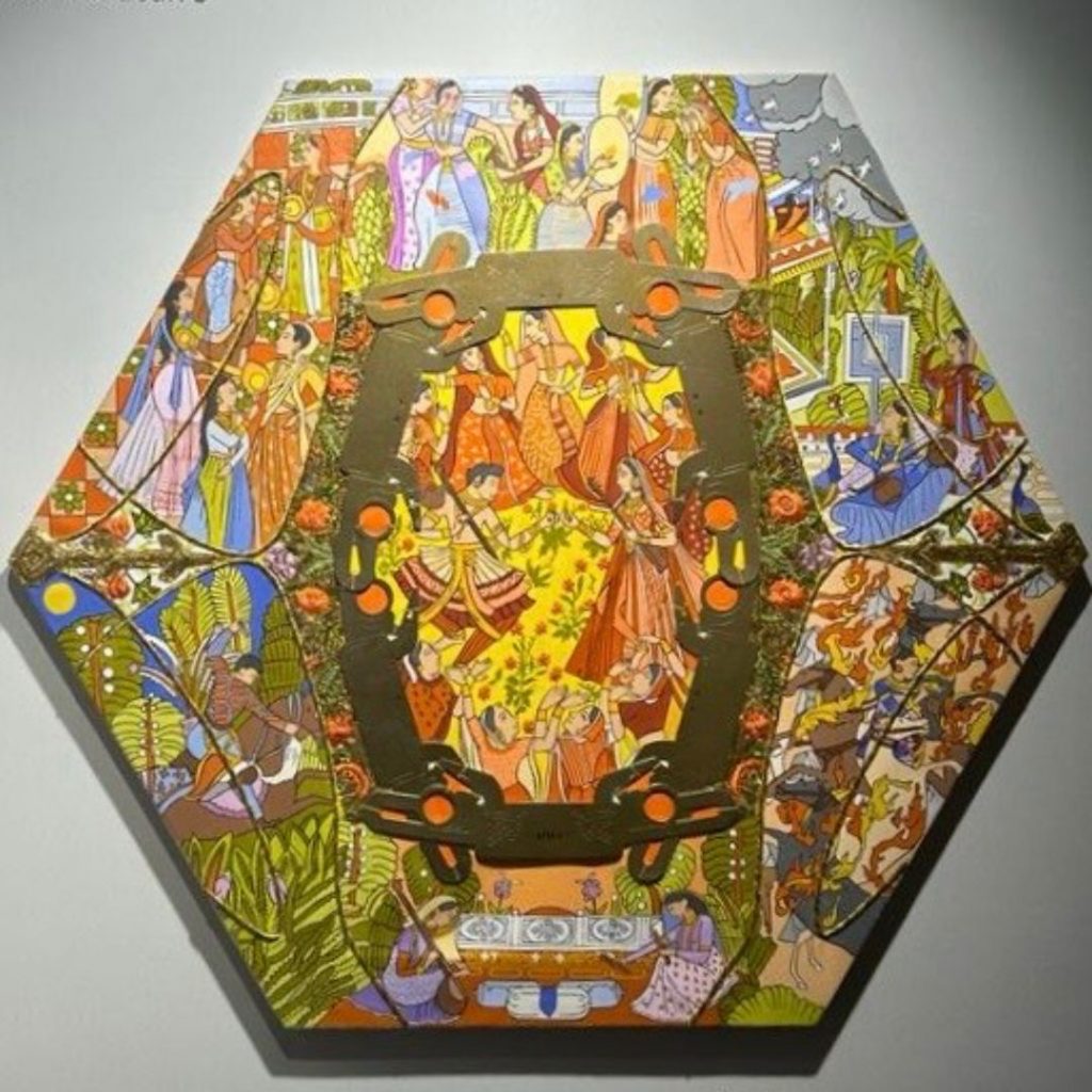 Painted by Bhumika Mukherjee and adorned with the artisanal mastery of Mohammed Ovaid Ansari, ‘Lavanya-yojanam’ unfolds as a choreographed dance on canvas — an orchestrated convergence of forms that yields a seamless and aesthetically pleasing composition. This artistic endeavour transcends mere arrangement; it is a clandestine methodology for constructing visual landscapes that allure and endure in the observer’s consciousness, akin to the enduring appeal of the Lamborghini Miura.