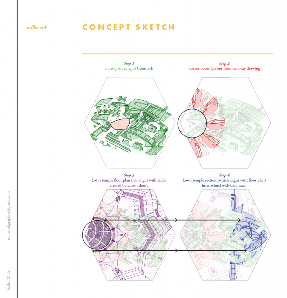 Exploring this dynamic interplay and drawing inspiration from architectural drafting principles, each layer of the artwork seamlessly links to the one above and below it. The radial plan of the Lotus Temple organises the Countach’s distinctive scissor doors, extending from the centre and aligning with the plan axes, resembling the delicate petals of a lotus. Extending outward from these doors, the rest of the car unfolds along a single line that connects its front and rear. An elevation of the Lotus Temple emerges from the plan, with its form intricately interwoven with elements of the Countach. Lastly, from beneath, lotus petals spiral outward, their arrangement echoing the golden ratio.