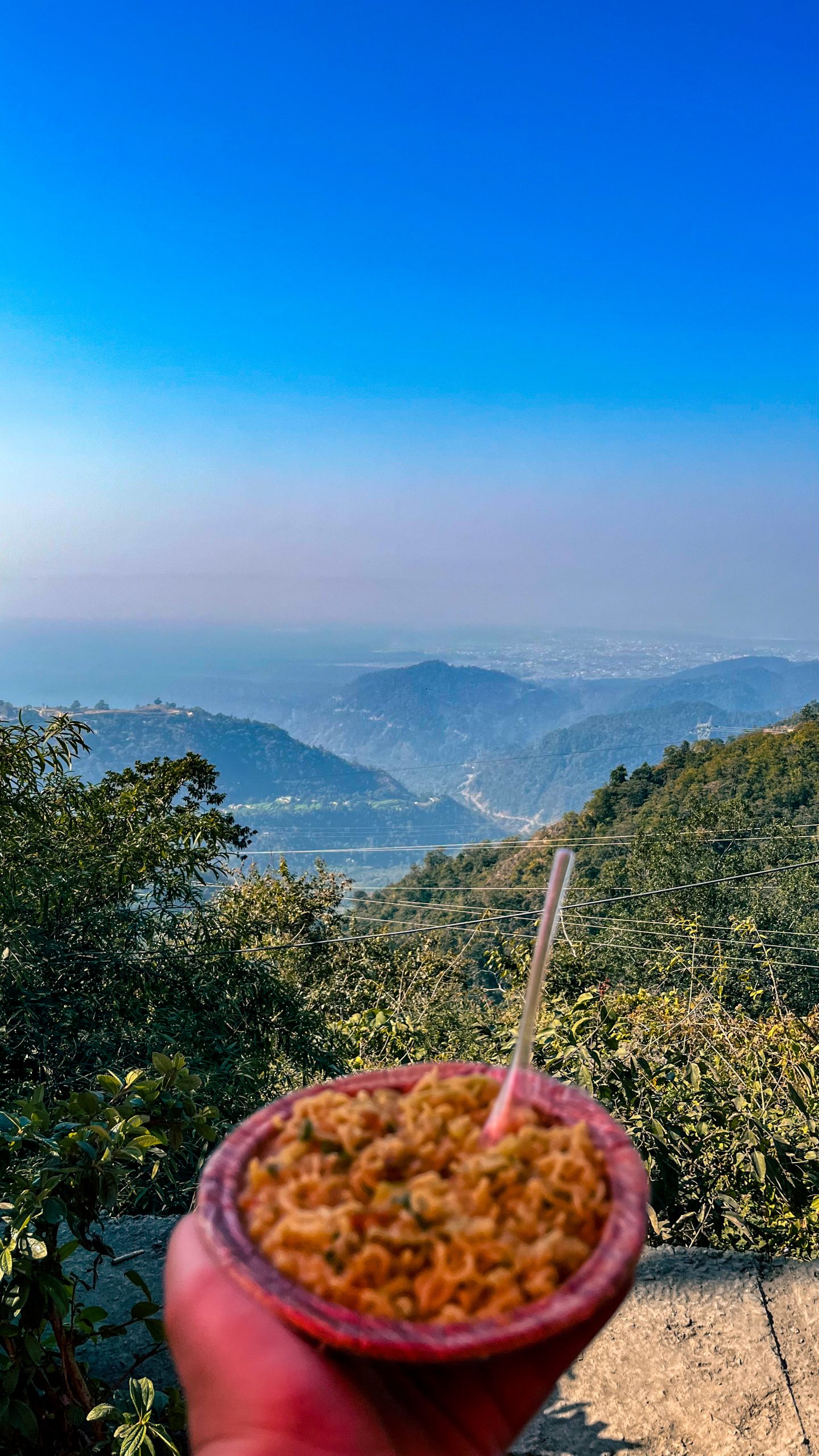 We paused for a while at a food bus parked at the roadside and ordered some snacks. Sipping chai and relishing momos, which surprisingly tasted different at high altitudes, while enjoying the peaks of the Himalayas is an experience hard to come by in our daily hustle and bustle.