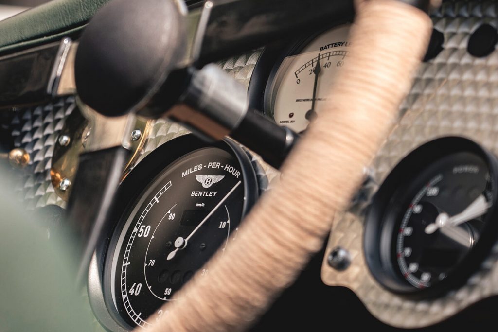 The first 99 units, known as the First Edition Models, are symbols of exclusivity, marked with First Edition insignias on the hood, door sill plates, dashboard, and a limited-edition ‘1 of 99’ plaque. Painted in the iconic Blower Green, with matching painted chassis and wheels, this nod to tradition proudly displays a hand-painted Union flag on both sides, celebrating its British heritage. Inside, opulence reigns with Dark Green Lustrana Hide upholstery reminiscent of the craftsmanship in the Blower Continuation Series. Subtle nods to its racing history can be seen on the side panels and radiator, while the meticulously crafted rope-bound steering wheel adds a touch of timeless elegance.