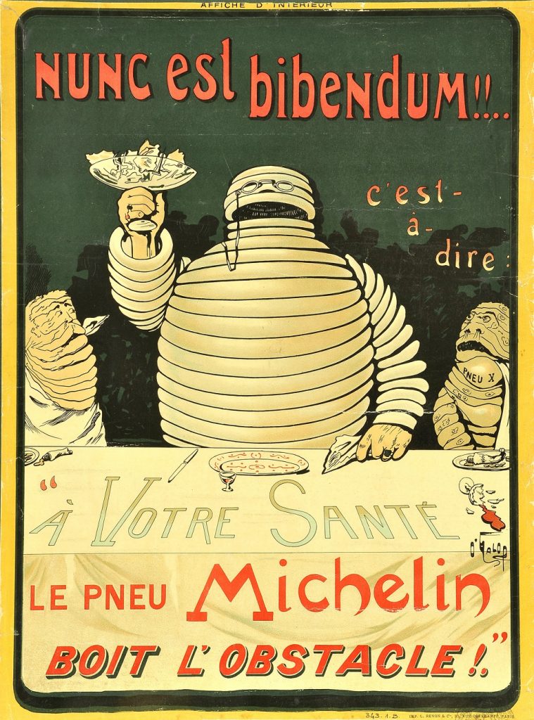 Conceived in 1898 by the Michelin brothers and artist Marius Rossillon (aka “O’Galop”), Bibendum was the ultimate tyre pitchman. His name, derived from the Latin phrase “Nunc est bibendum” (“Now is the time to drink”), symbolises Michelin Tyres’ ability to slurp up obstacles on the road with ease.