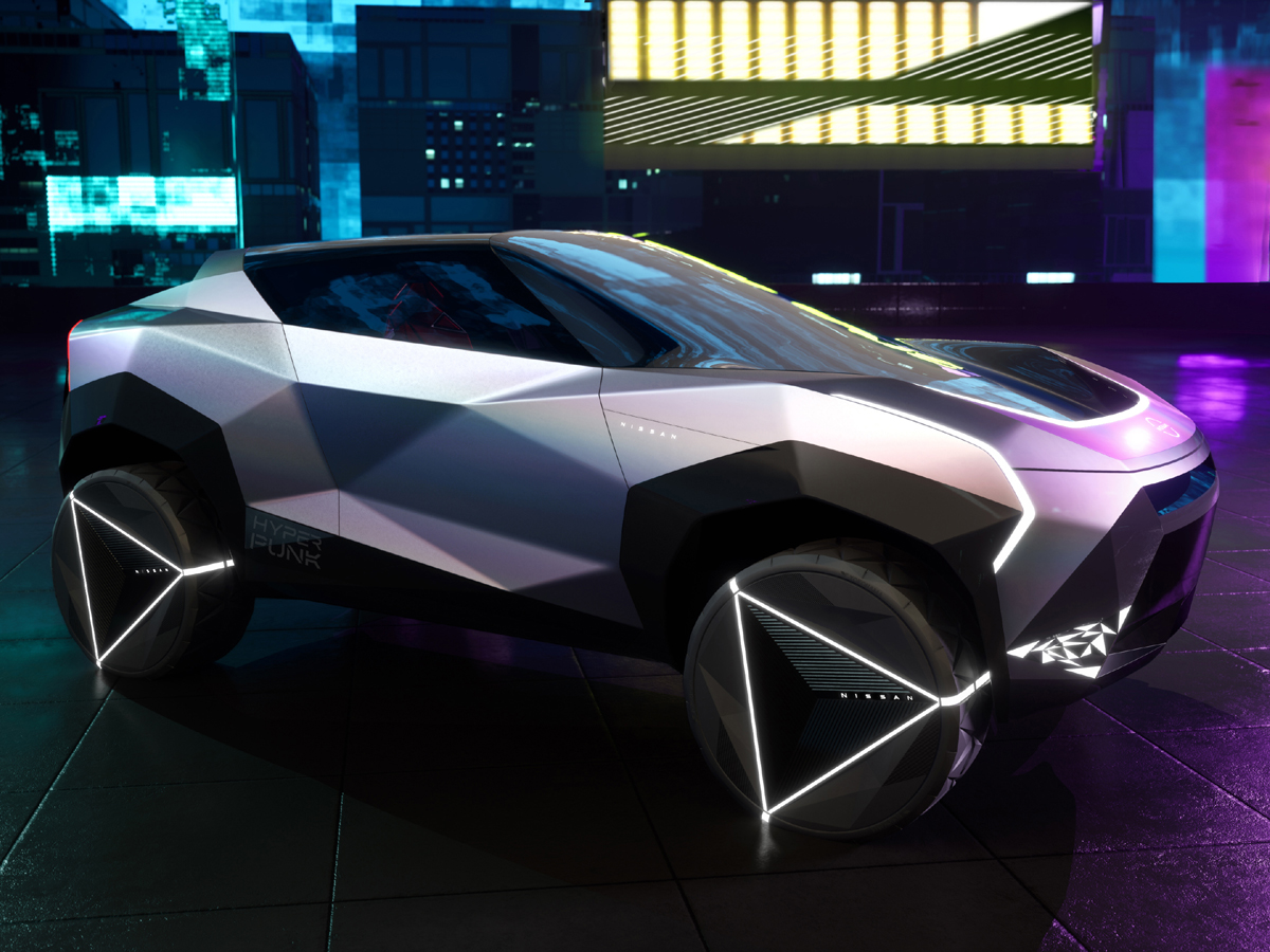 According to Nissan, the Hyper Punk concept is ‘an all-electric compact crossover tailored for content creators, influencers, artists, and those who embrace style and innovation.’ The futuristic exterior look is achieved with a continuous flow of polygonal surfaces, which makes the vehicle stand out.