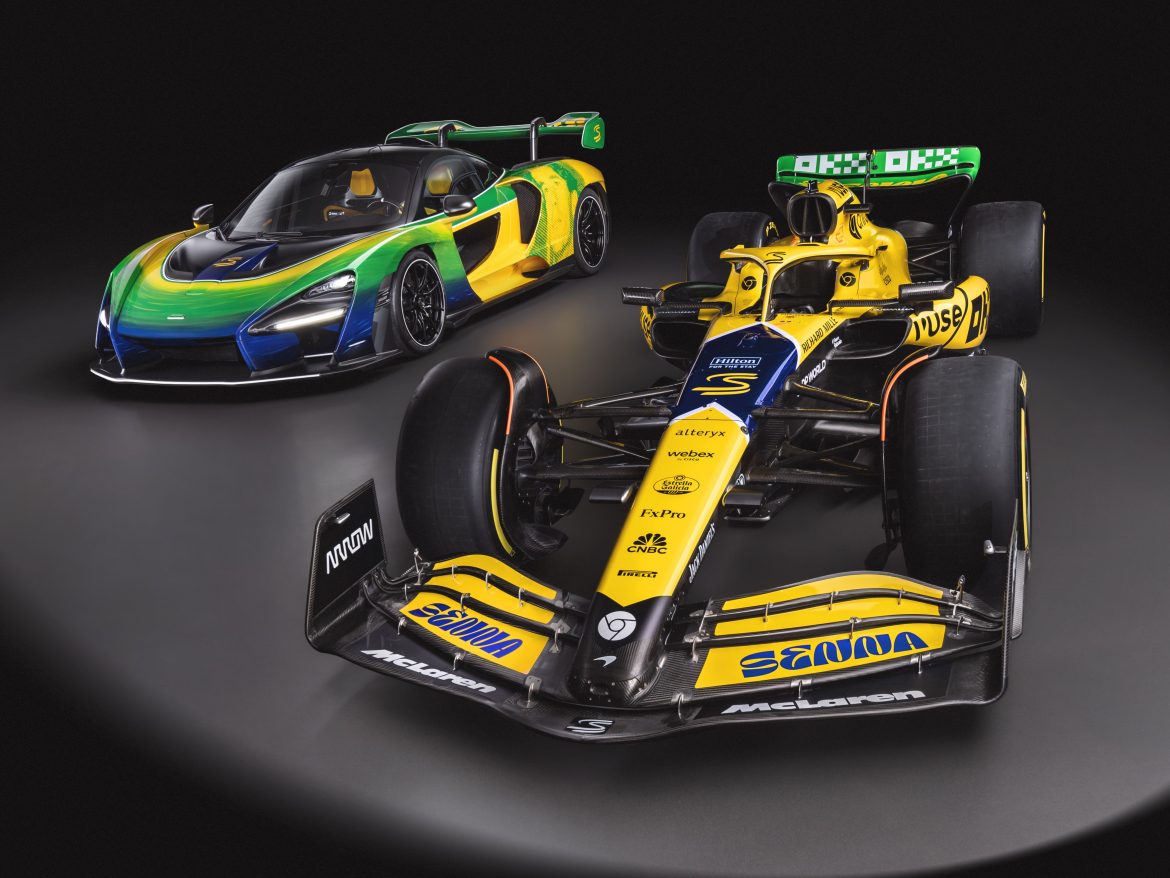 Similarly, the McLaren Formula 1 Team has created a bespoke one-off livery for the MCL38 race car. The vibrant yellow, green, and blue colour scheme is inspired by Ayrton Senna’s race helmet which also features in the Senna Sempre livery.