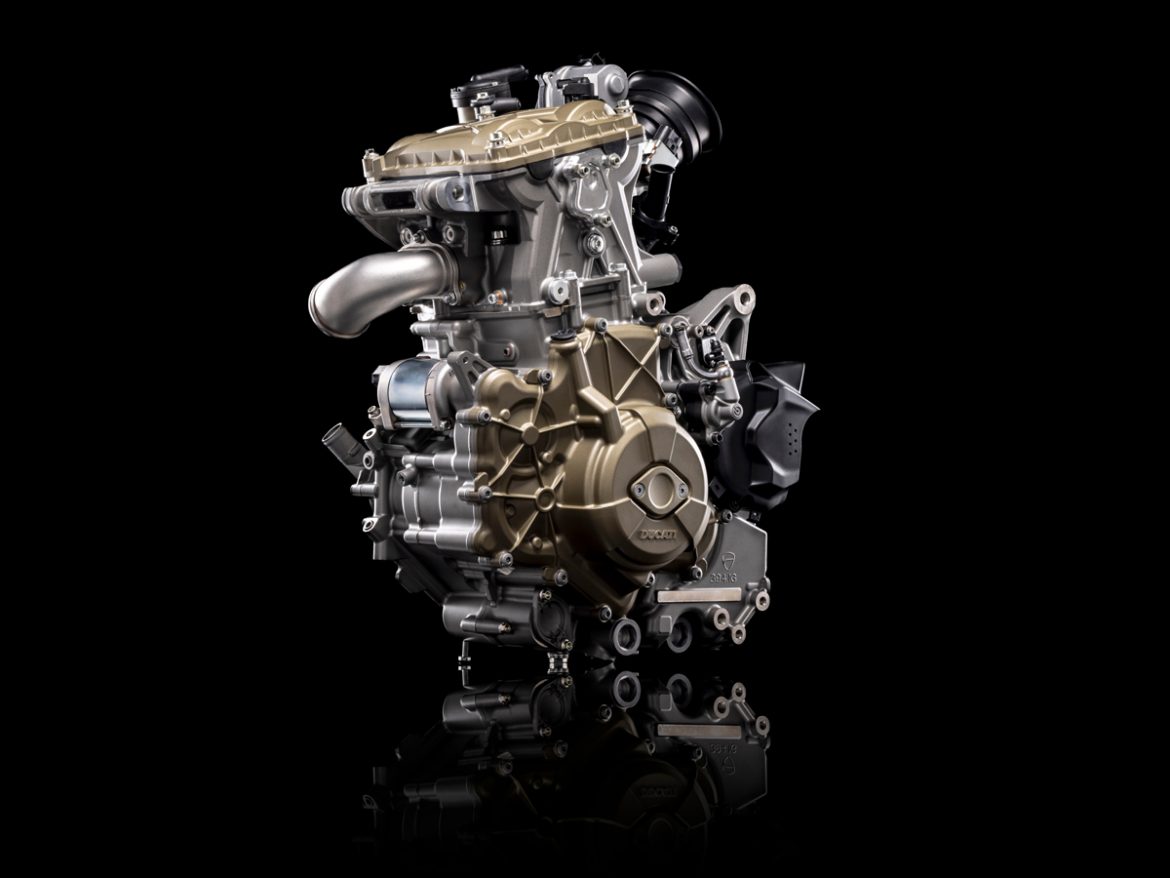 For effective cooling and weight management, the die-cast engine crankcase has been made from aluminium, and the clutch, alternator and head covers are made of cast magnesium alloy to further reduce weight. Two balancing countershafts mounted on ball bearings inside the crankcase, which also control the water and oil pumps, help limit the vibration levels to that of a comparable 90° V-twin. The engine works with a six-speed gearbox with ratios similar to those seen on the Panigale V4. It can also be equipped with a Ducati Quick Shift (DQS) Up & Down.