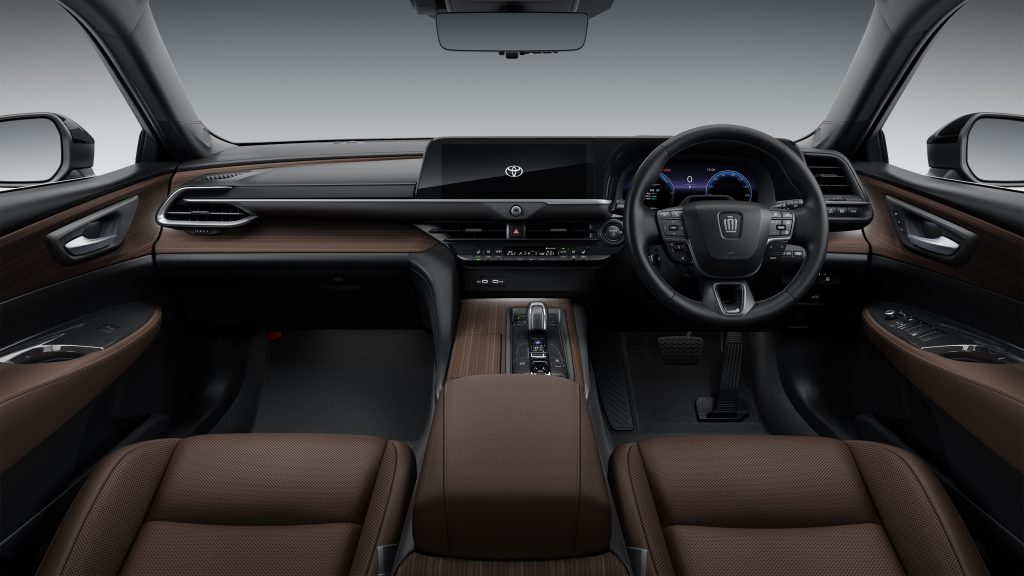 Inside, the Crown Sedan highlights island architecture, with a large wood-grain panel extending seamlessly from the instrument panel to the doors and a console that emerges from the panel. The cabin offers a spacious yet composed environment.