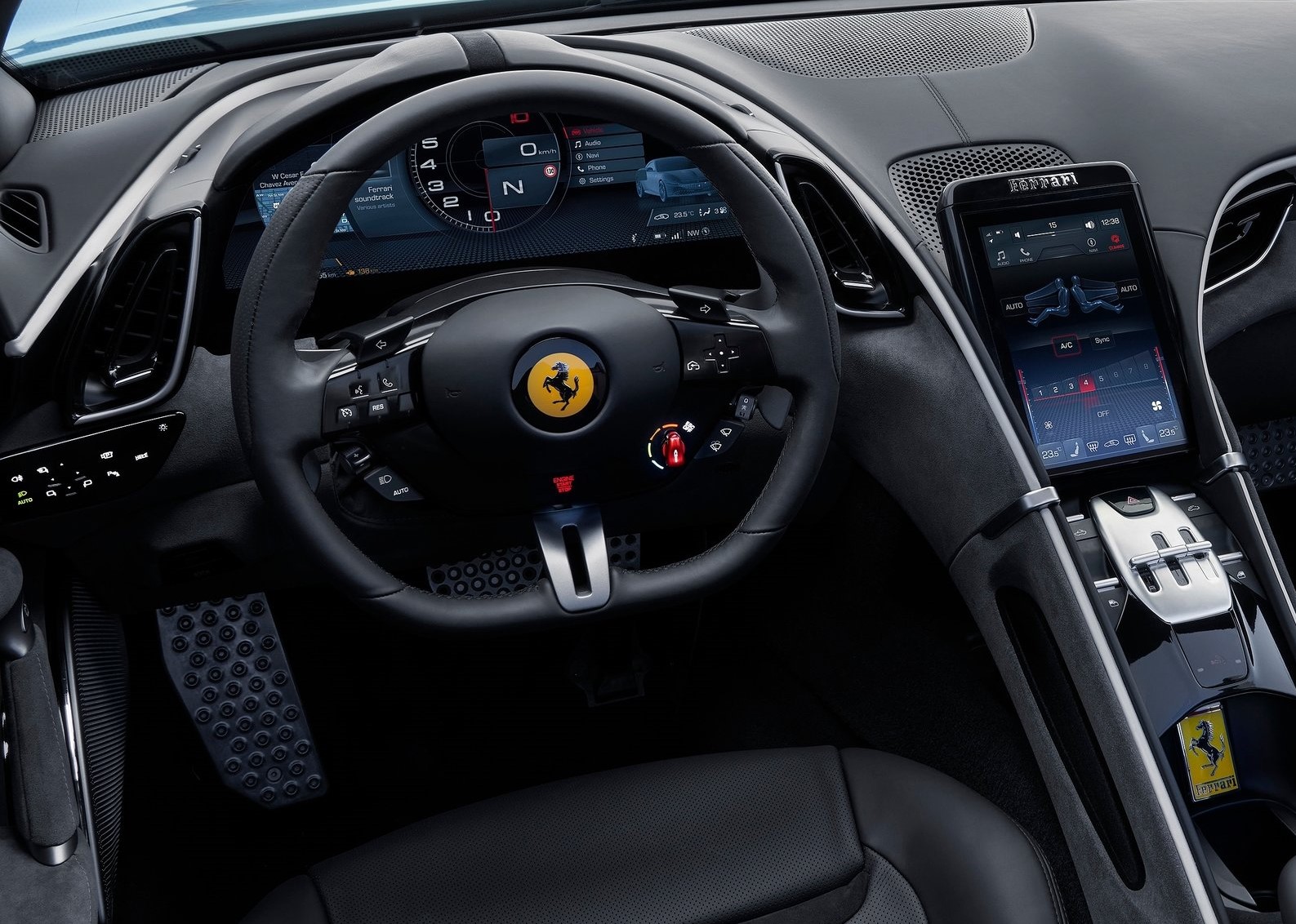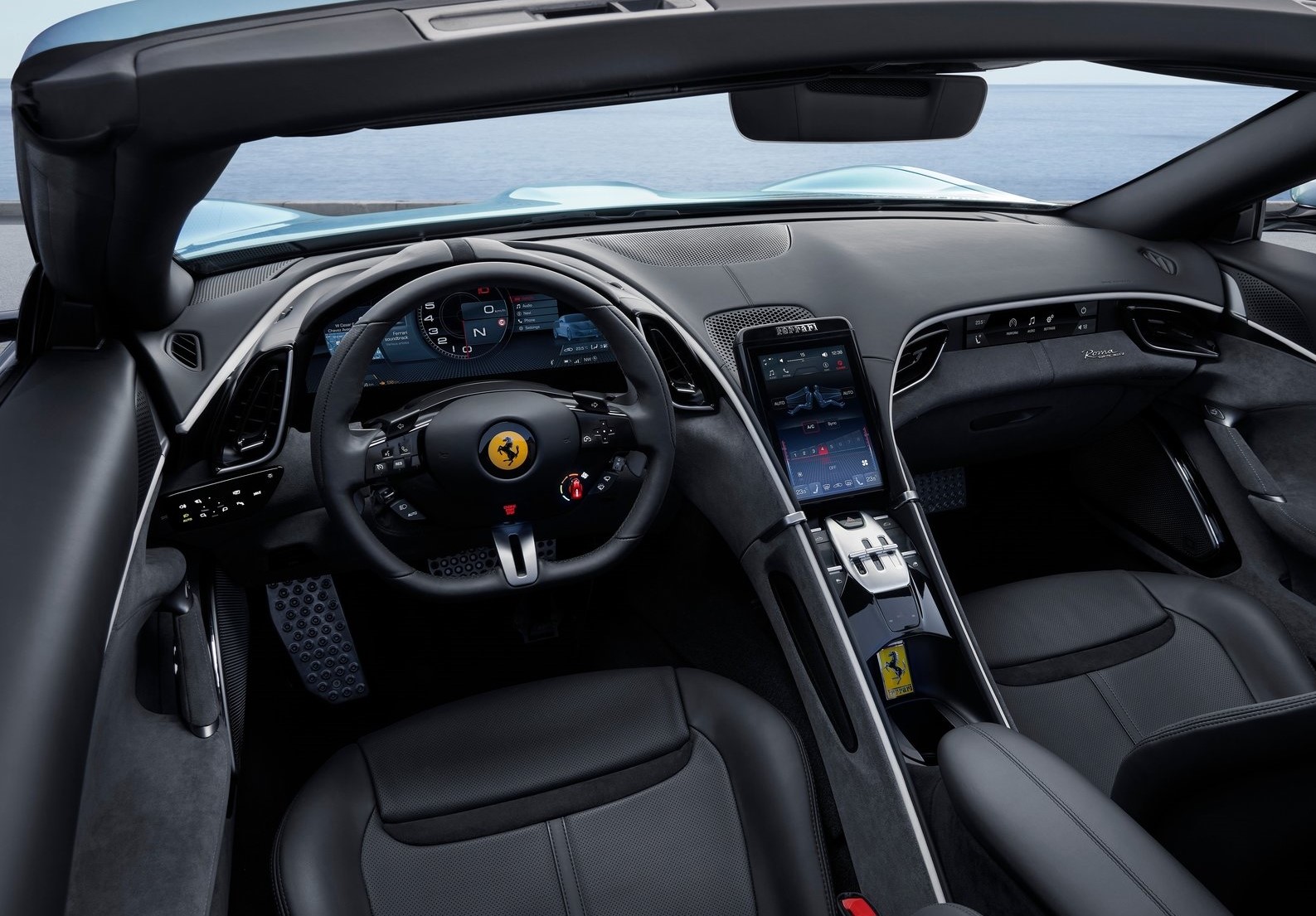 The technology adopted is derived from the Ferrari Roma: the digital instrument cluster is integrated with the volumes around it and protected by an anti-glare binnacle which extends out naturally from the dash.