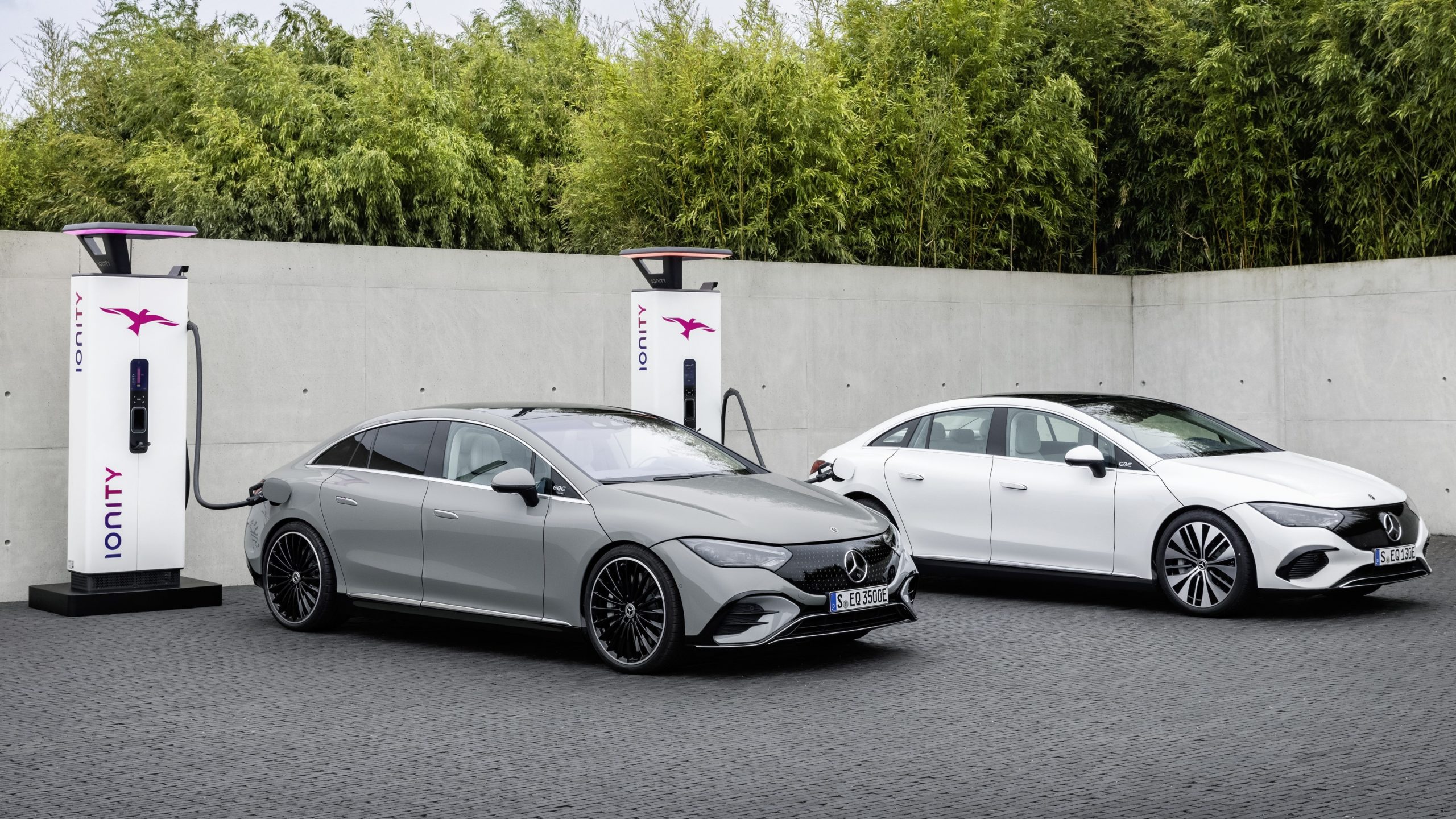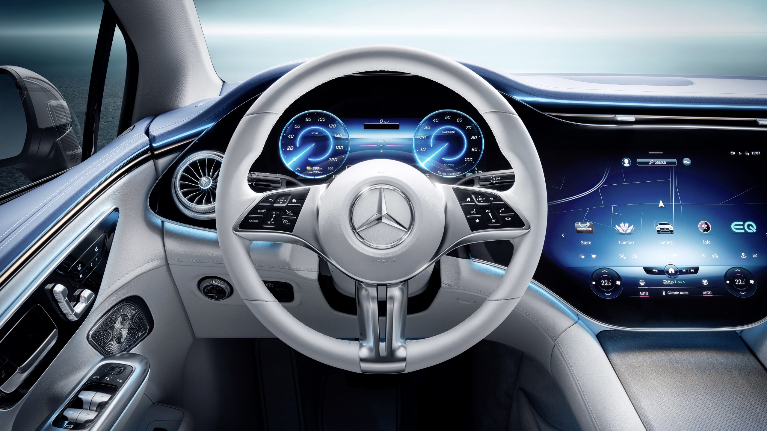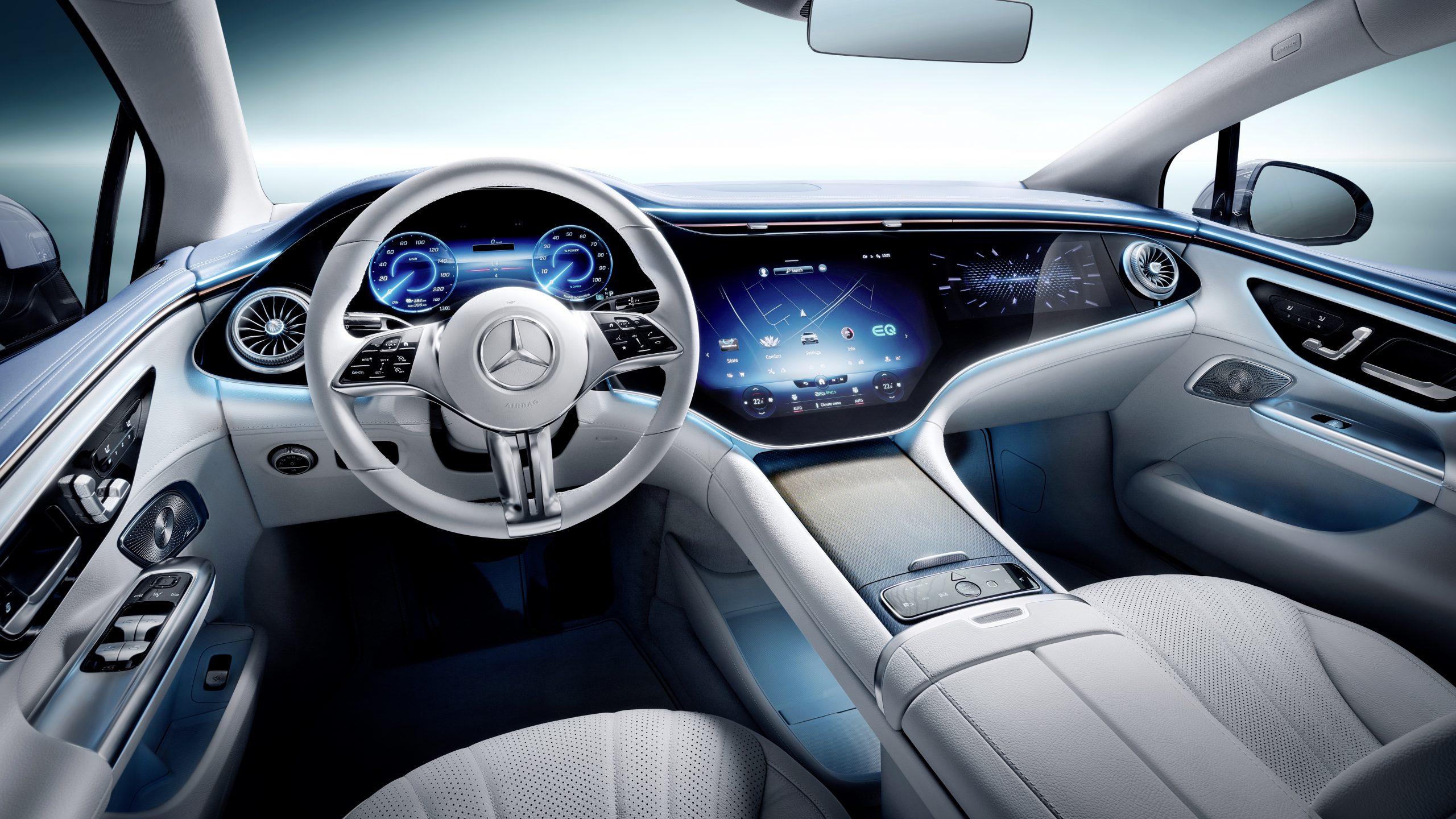 The interior design and equipment is based on the EQS, with features like the MBUX Hyperscreen, automatic comfort doors (front), and rear-axle steering available as optional extras.