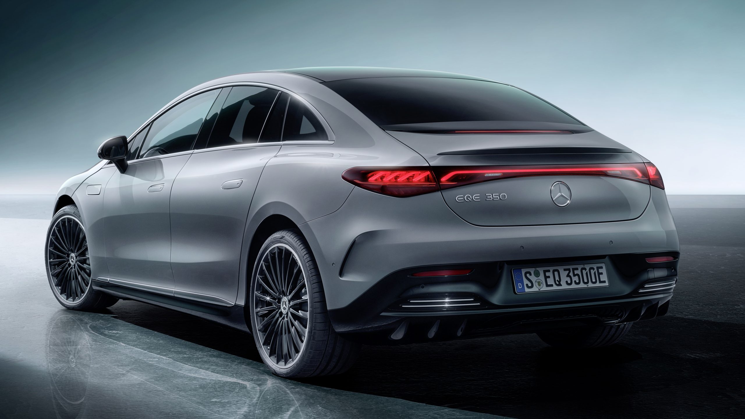 The rear forms a dynamic accent with a sharp-looking spoiler. Flush with the outer edge of the body, the 19- to 21-inch wheels, together with a muscular shoulder section, give the EQE an athletic character.