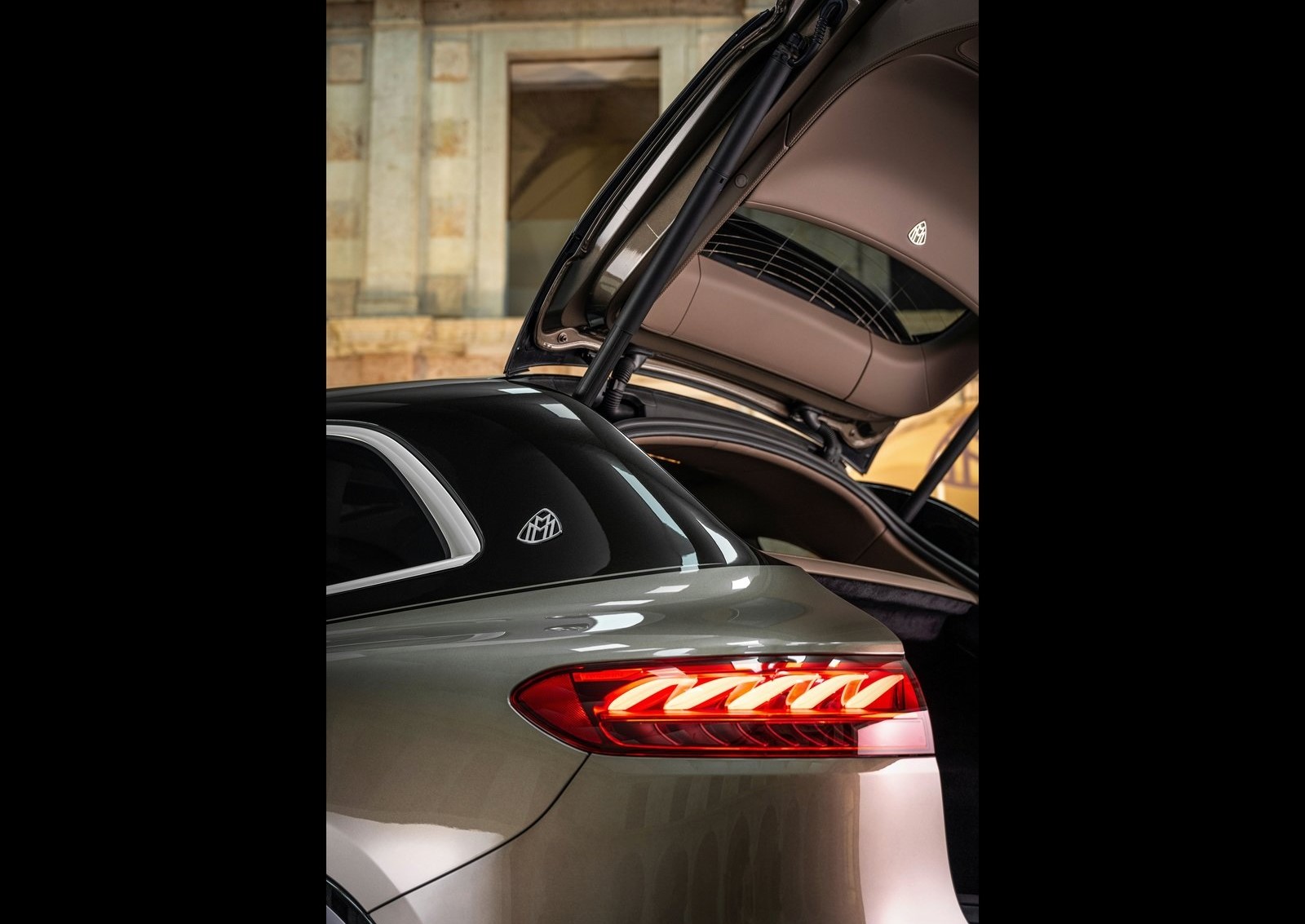 At the rear, the rear lights underline the exclusive character as a continuous light strip with a two-part helix. The lights are animated across the entire width. There are also chrome trim elements on the tailgate, on the rear apron and the spoiler lip, as well as the MAYBACH lettering.