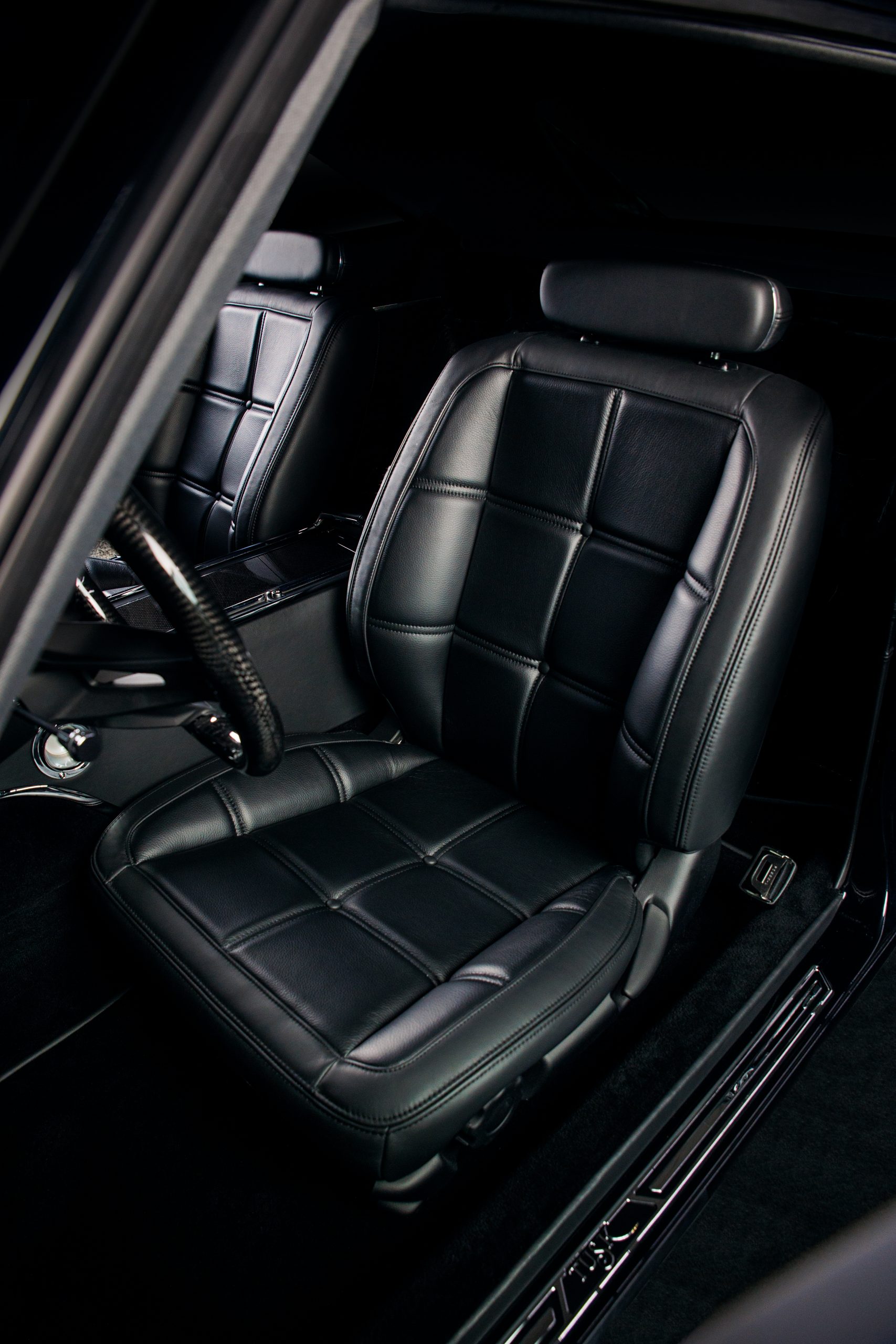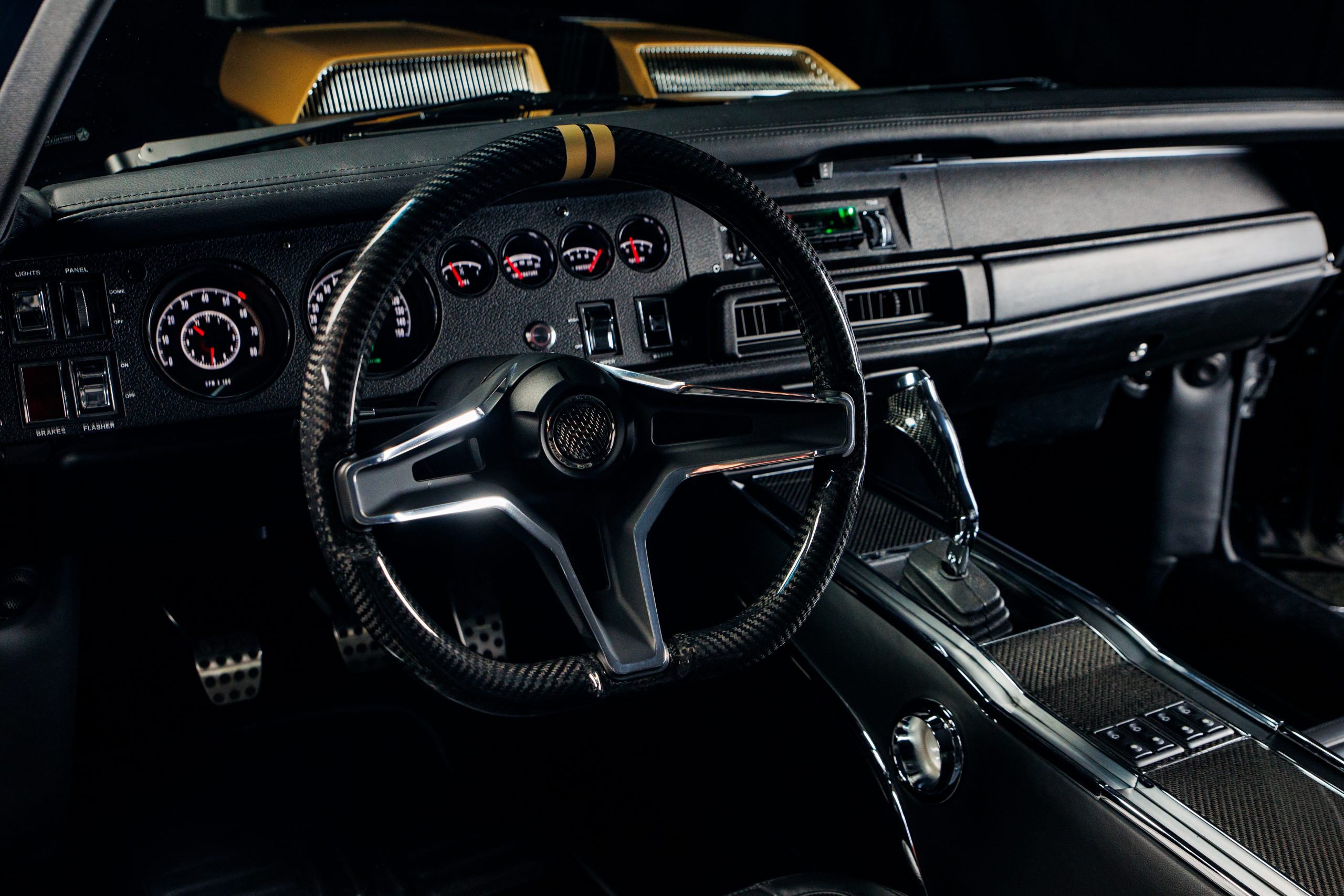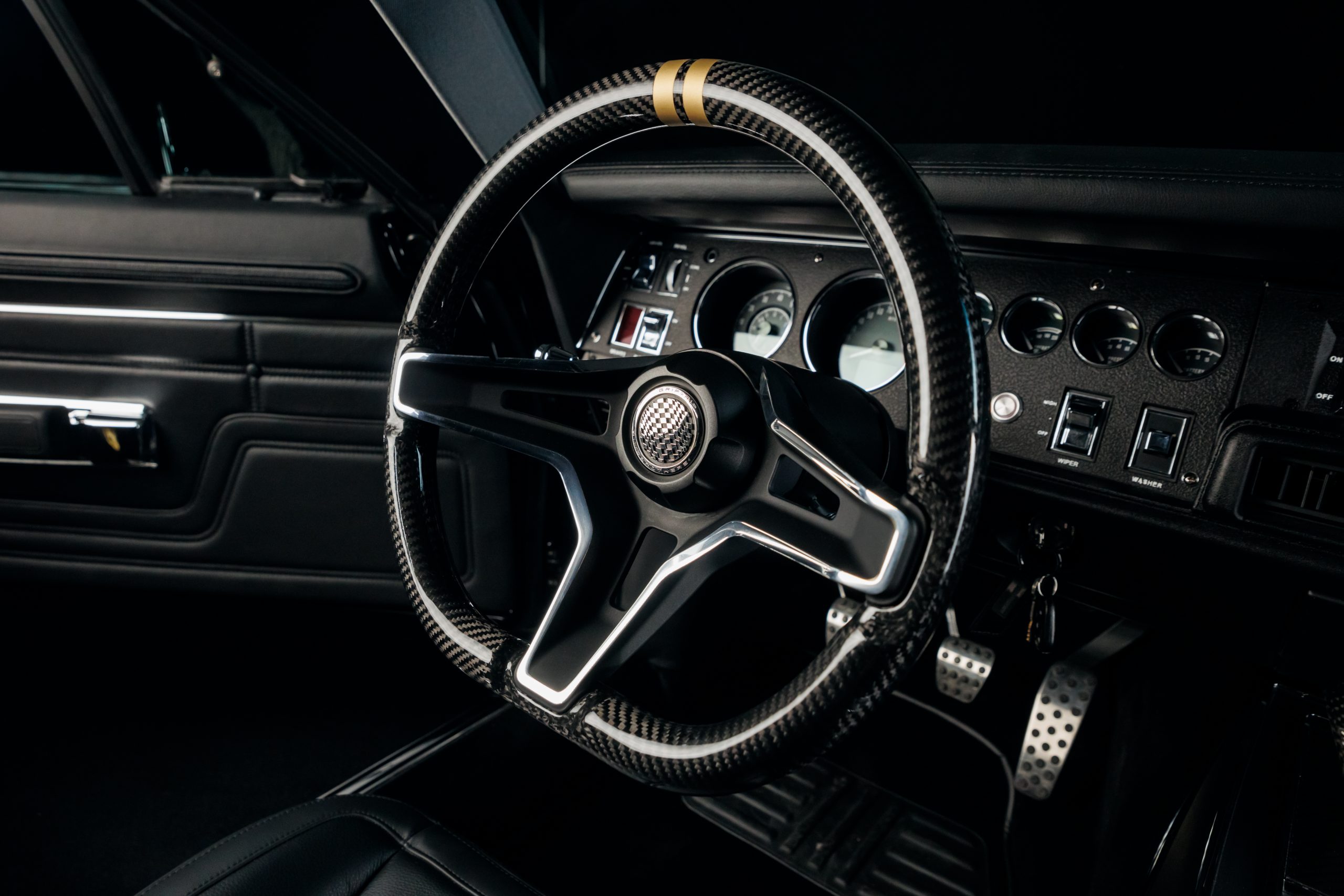 The Tusk’s bespoke custom leather interior has been tailored by Upholstery Unlimited and it features elements like a carbon fibre console, steering wheel, ‘pistol grip’ gear shifter, and Dakota Digital gauges, to name a few.