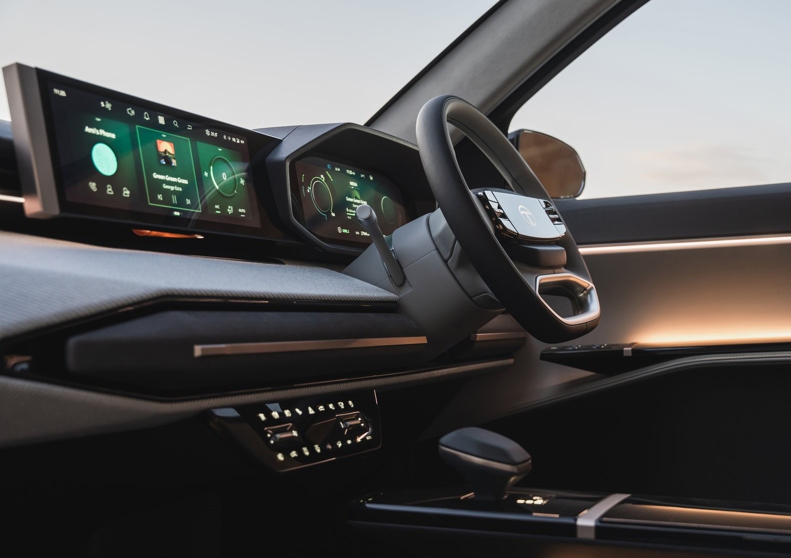 The steering wheel represents the intensified digital DNA with an illuminated logo in the centre augmented by two switches on either end for the driver to communicate or interface with the product with effortless ease.
